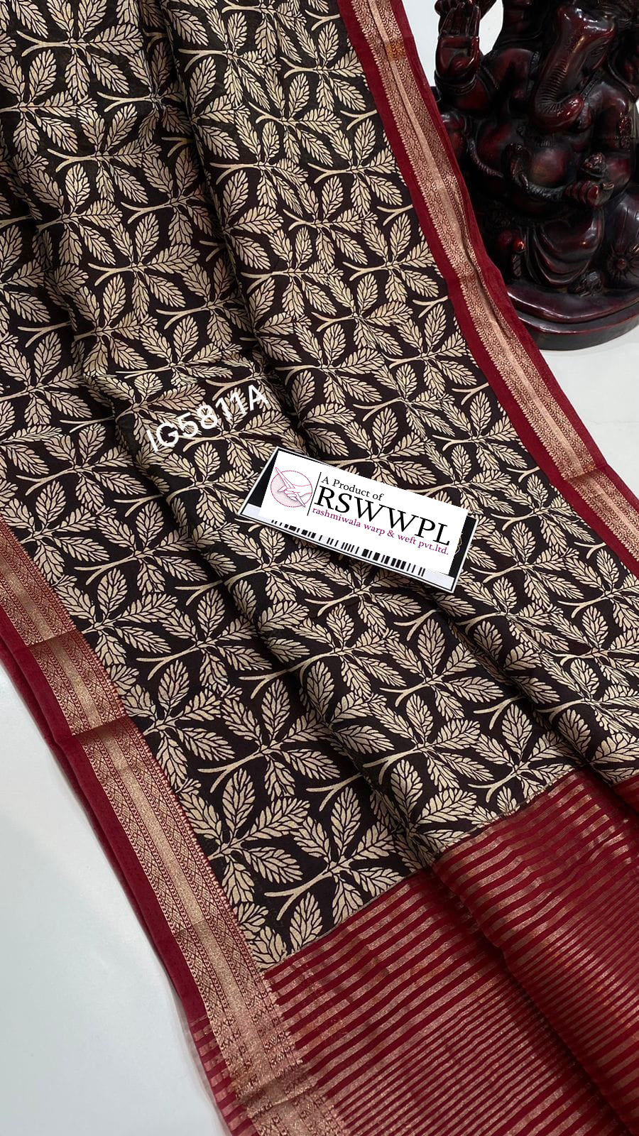 Elegant Dola silk saree with leaf print, tassels, black base, and red border, exuding timeless sophistication