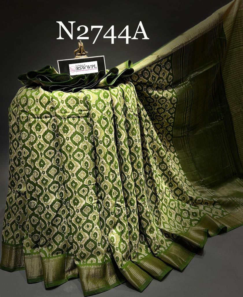 Elegant green Dola silk saree with beautiful prints, blending traditional charm with modern elegance