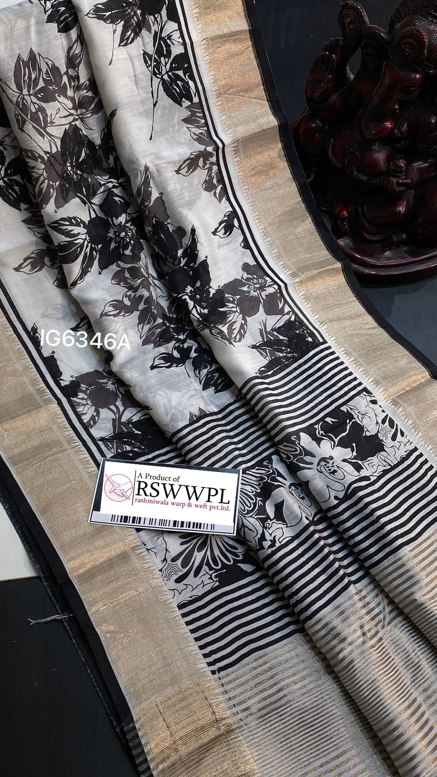 White nd Black Lightweight, soft Assam silk with woven border and beautiful prints.