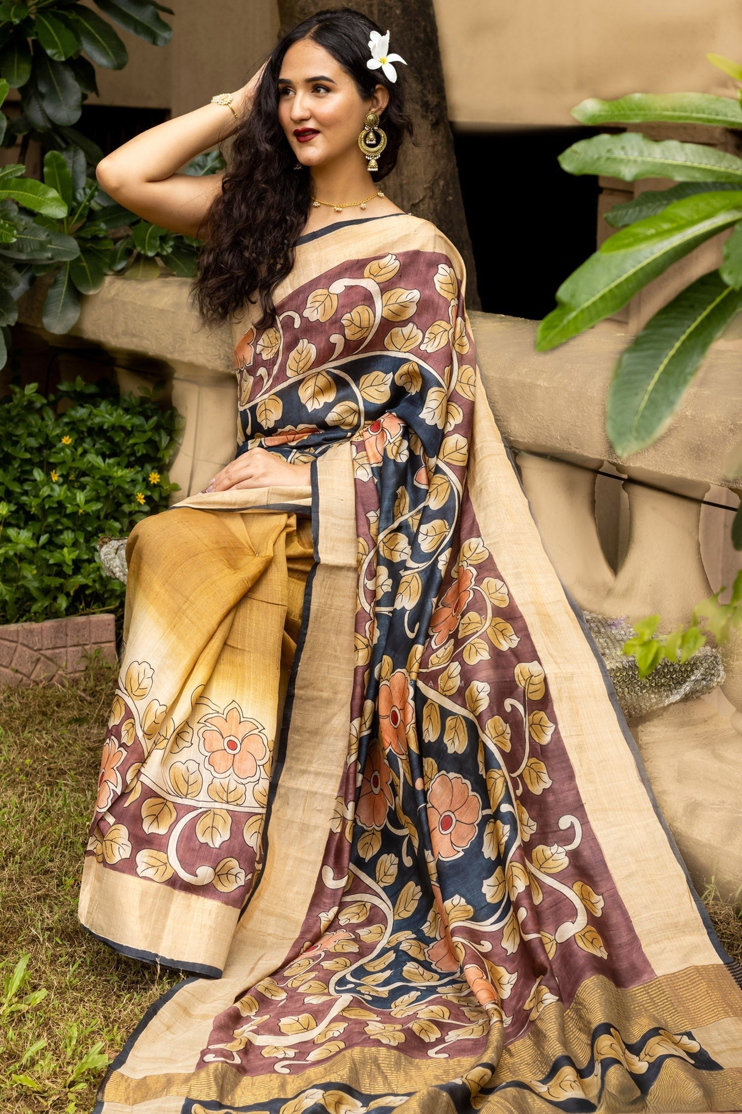Designer Tussar Silk Saree Kalamkari Printed Handloom Finish With Blouse