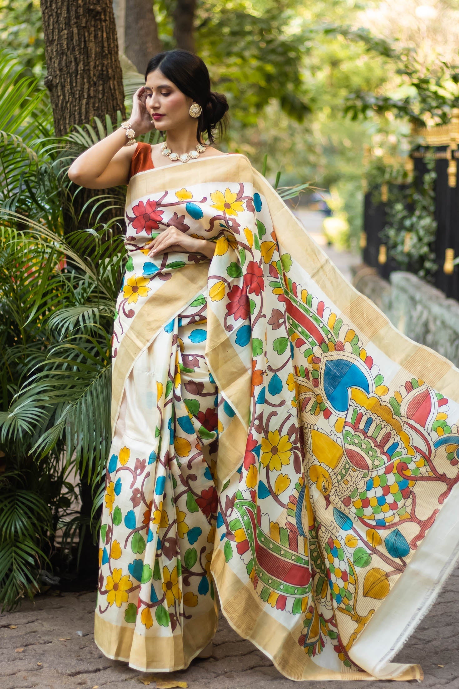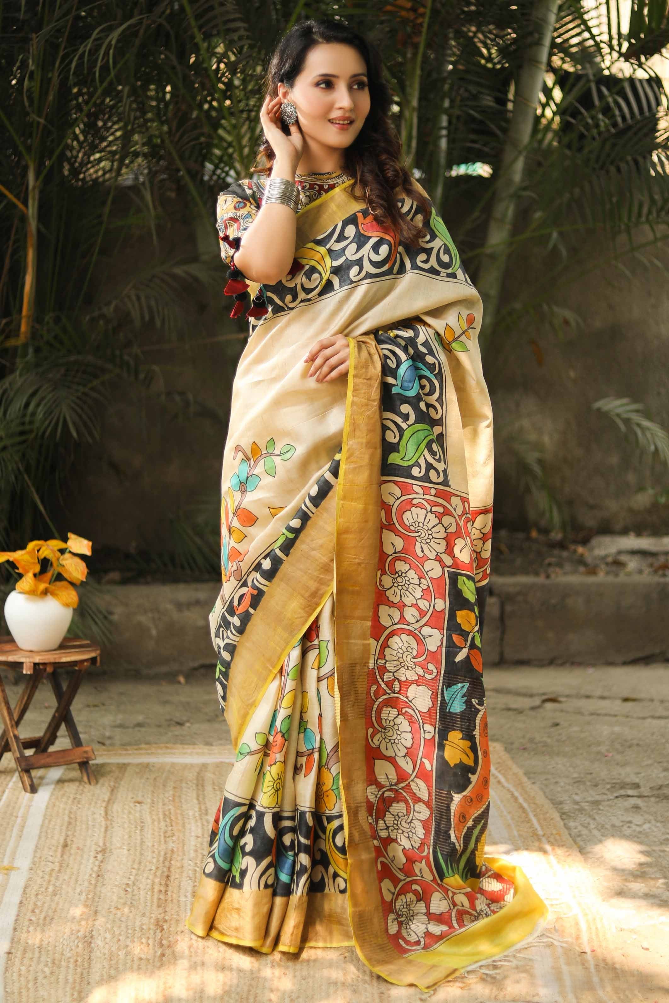 Timeless Luxury Handloom Kalamkari Print Tussar Silk Cream Saree