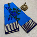 Trendy Blue Digital Print Mysore Saree In Soft Silk With Traditional Zari