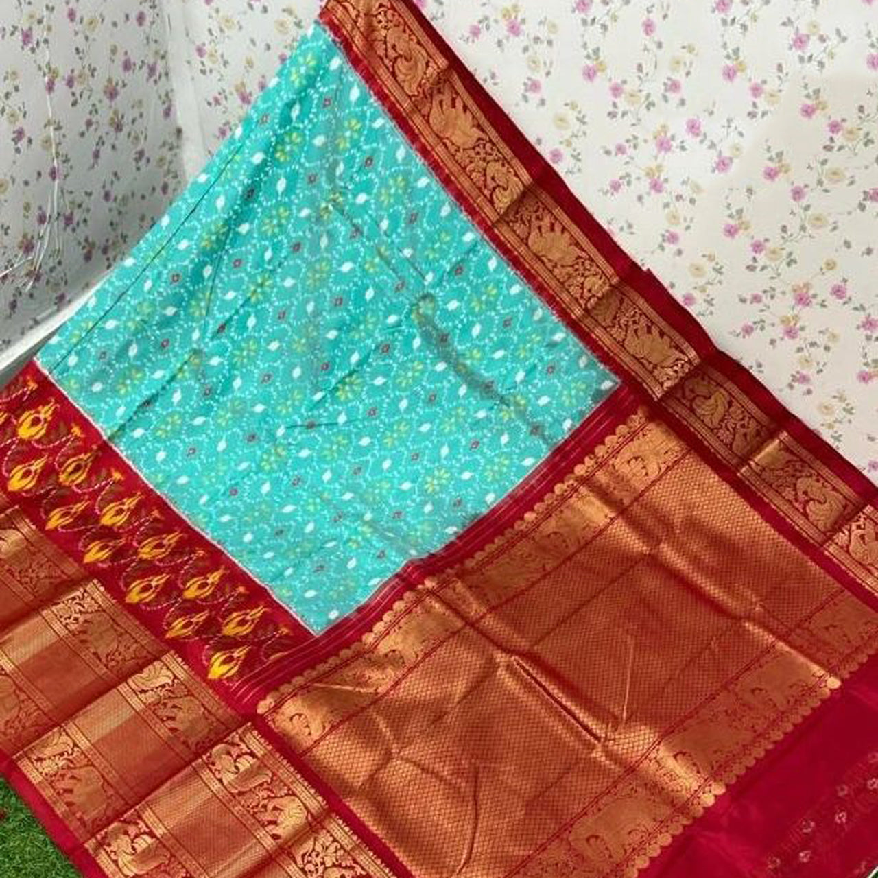 Lovely Light Cyan Handloom Ikkat Print Silk Saree With Royal Borders