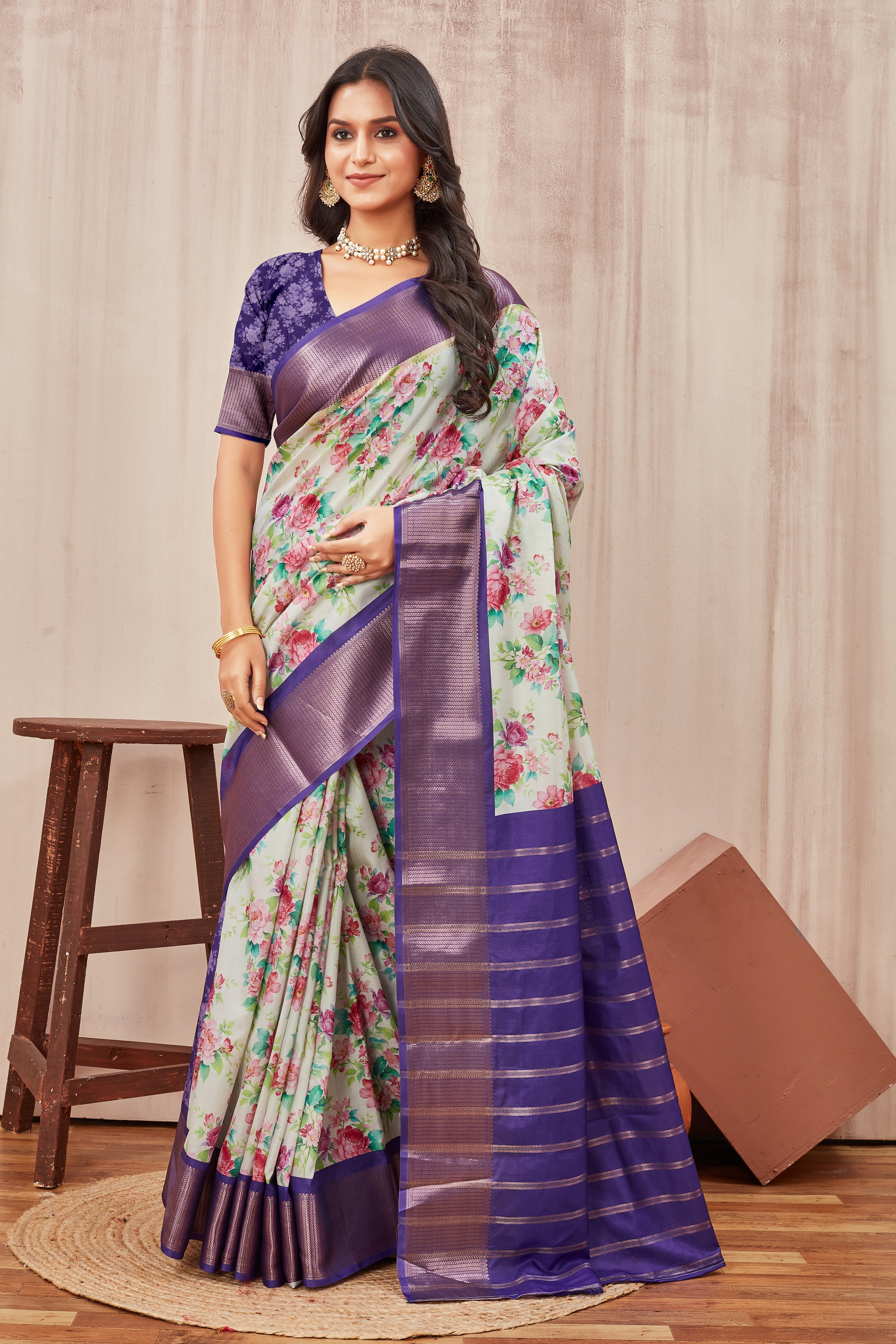 Mysore Crepe Floral Digital Print Off White Saree With Blouse