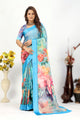 An exquisite GEORGETTE fabric featuring a soft, flowing drape and a subtle natural sheen. It highlights vibrant multicoloured floral GEORGETTE set against a pink backdrop, further enhanced by printed borders on the same base. This traditional viscose georgette saree is beautifully crafted with digital prints and comes with an unstitched matching blouse piece, offering the flexibility for personalised tailoring. Ideal for festive celebrations, poojas, and daytime weddings, it is best preserved through dry cleaning to maintain the fabric’s integrity and the delicate zari work.