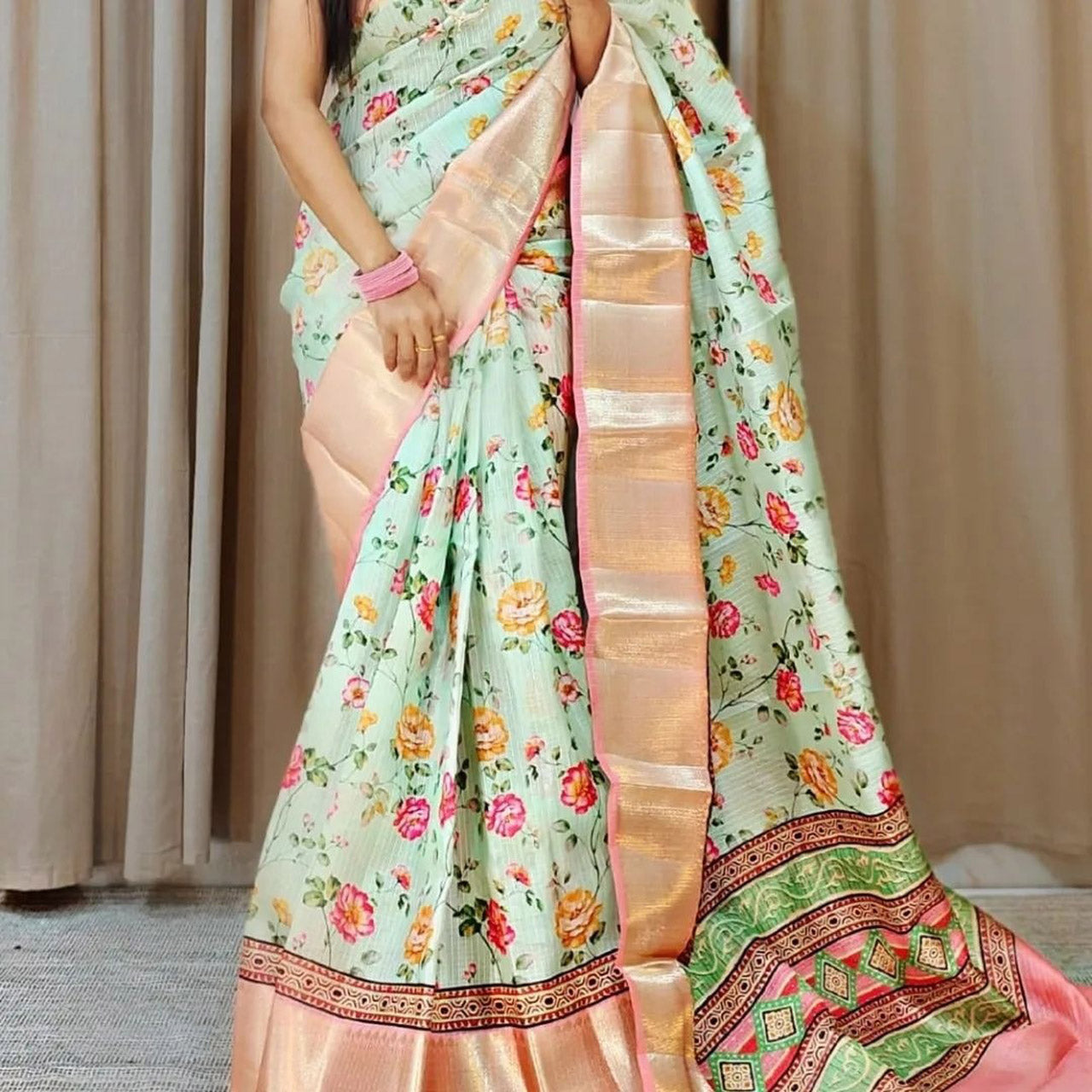 Beige Luxe Bloom Digital Printed Kota Silk Saree