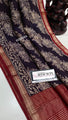 "Elegant Dola silk saree with leaf print, tassels, blue, red, and white, exuding timeless sophistication."