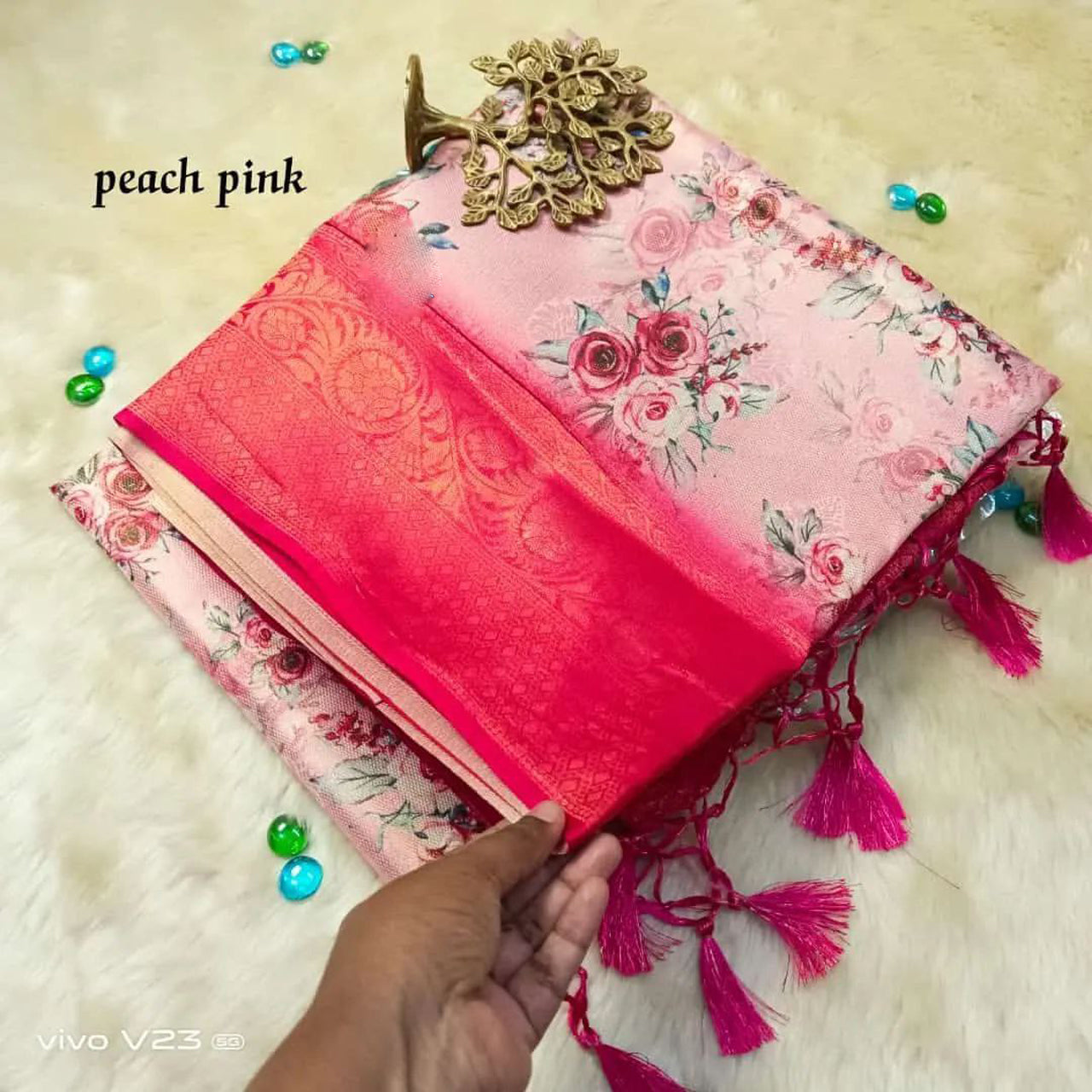 Attractive Peach Color Digital Printed Rich Pallu Soft Silk Designer Saree