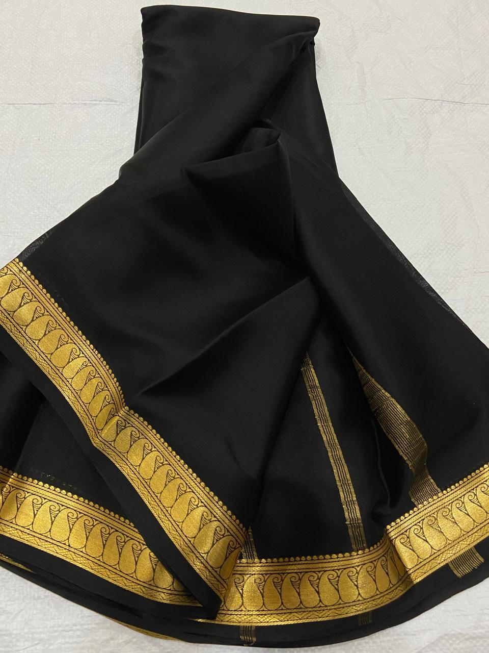 Black Mysore Soft Silk Saree With Gold Zari Blouse