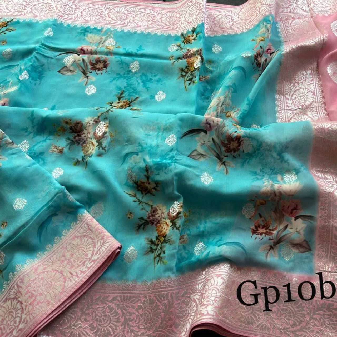 Attractive Blue Feather Light Butter Silk Saree With Artistic Prints