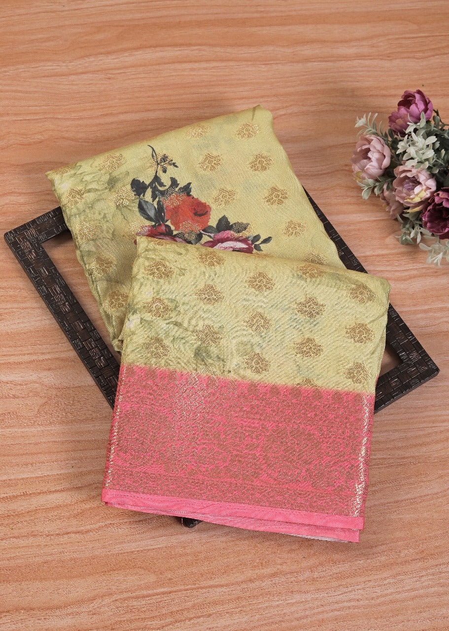 Beautiful Soft Silks Digital Print Golden Saree With Blouse