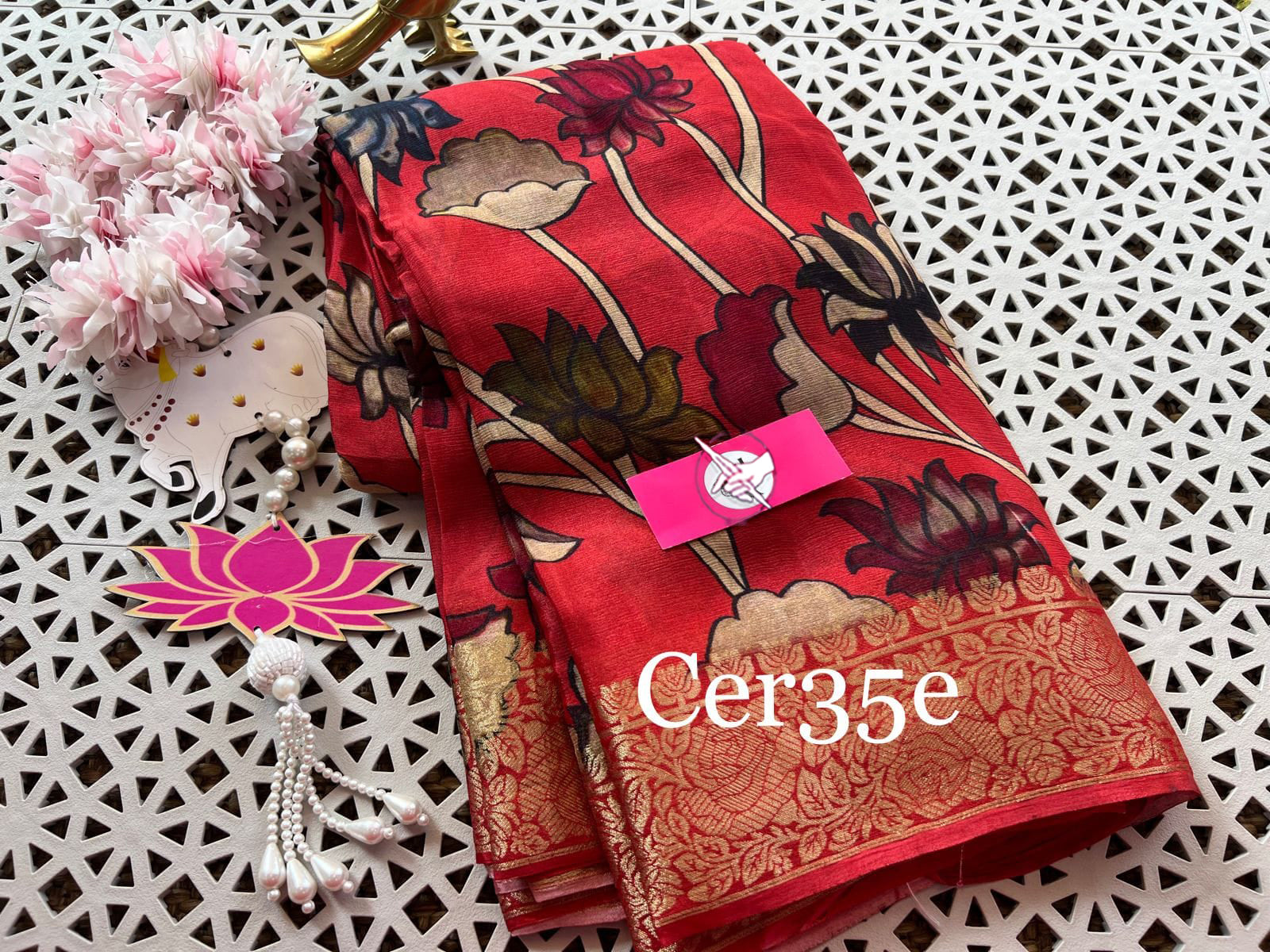 Red floral print saree with striking contrast border, epitomizing elegance and sophistication, perfect for special occasions.