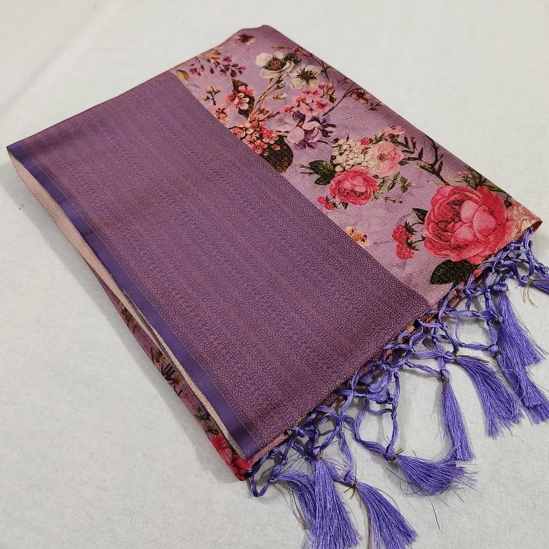 Cultural Purple Soft Silk Kubera Pattu Saree With Artistic Print Work