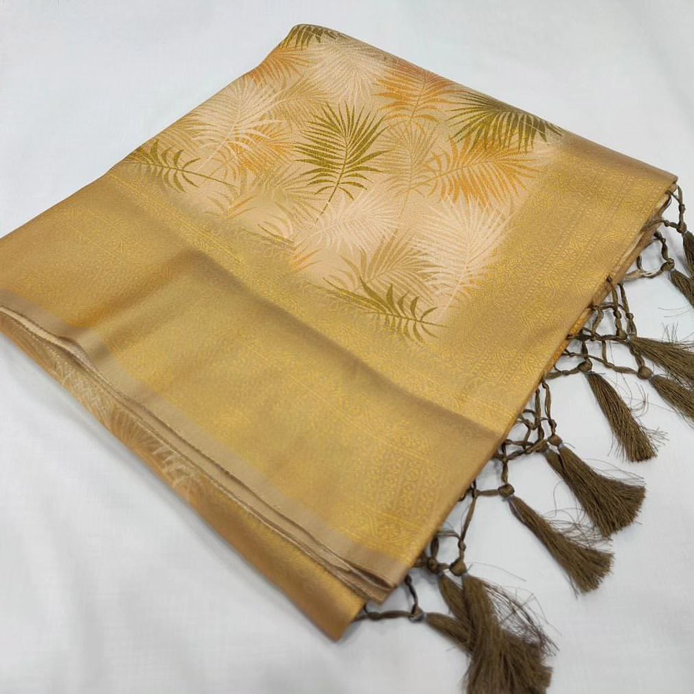 Eye Catching Beige Soft Silk Saree With Digital Designs And Kubera Pattu Influence