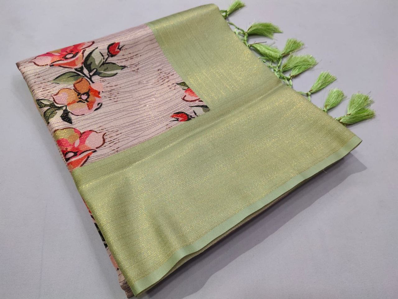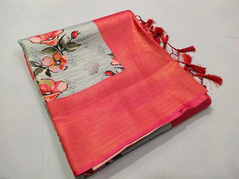 SOFT SILK FABRIC WITH FLORAL DIGITAL PRINT on COPPER JARI weaving & CONTRAST BORDER N RICH GRAND PALLU