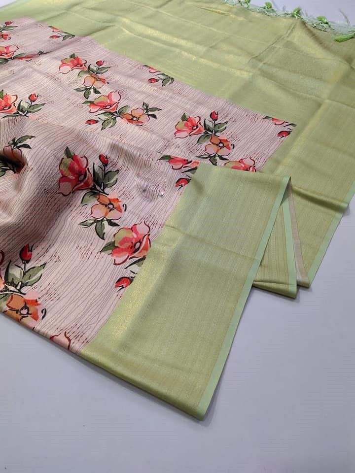 Grey With Green Floral DIgital Print Soft Silk Saree