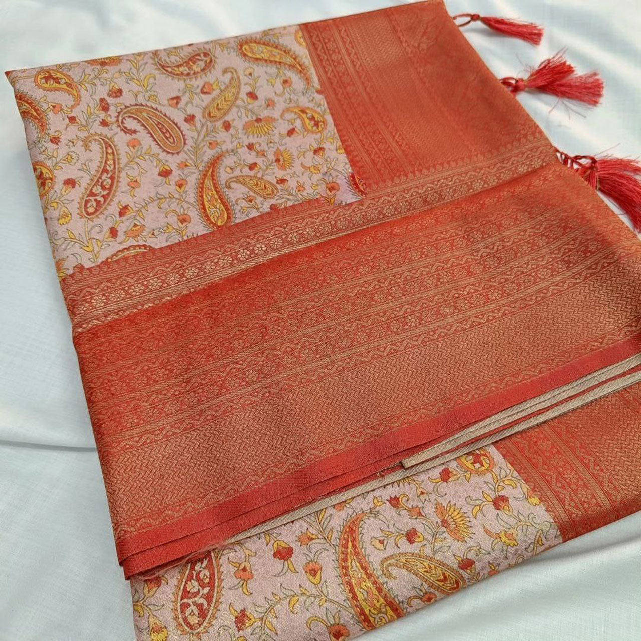 Beautiful Soft Silks Digital Print Golden Saree With Blouse