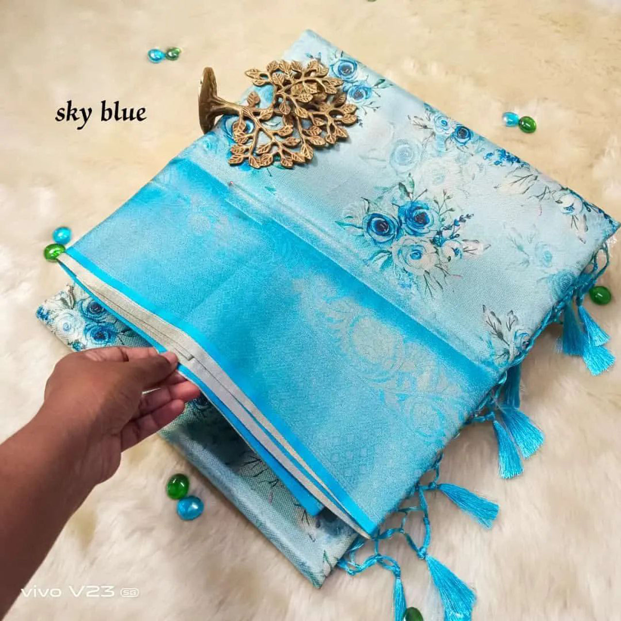 Sky Blue Color Digital Printed Daily Wear Soft Silk Fabric Saree