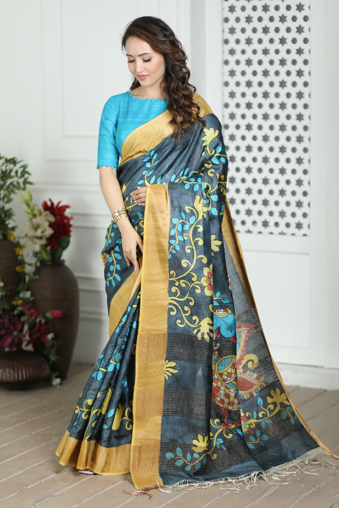 Authentic Handloom Tussar Silk Saree Kalamkari Motif With Blouse Fabric