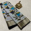 Discover the exquisite charm of our exclusive pure crepe Mysore silk sarees, adorned with vibrant floral prints that bloom across the entire body. Each saree is a masterpiece, featuring contrasting borders that add a striking edge to the elegant design. The rich, smooth texture of pure crepe silk drapes gracefully, enhancing your natural elegance with every step.